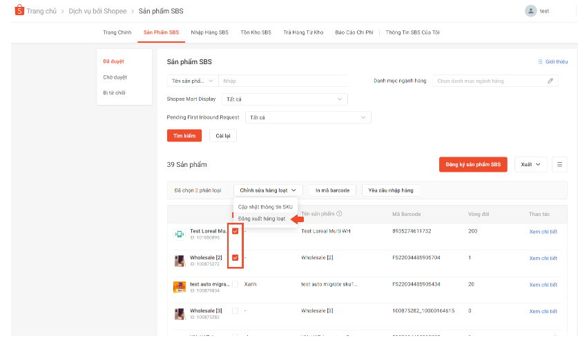 Bước 2: Chọn các sản phẩm cần đăng xuất > nhấn vào Chỉnh sửa hàng loạt > chọn Đăng xuất hàng loạt.