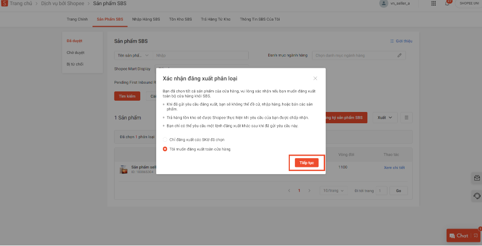 Để đăng xuất toàn cửa hàng khỏi dịch vụ SBS, Người bán thực hiện như bước ở trên. Tuy nhiên ở Bước 2: Bạn cần chọn tất cả sản phẩm của Shop > chọn Đăng xuất hàng loạt. >> Sau khi hoàn thành, người bán sẽ thấy cửa sổ thông báo hiện lên như bên dưới, nhấn Tiếp tục để xác nhận đăng xuất.