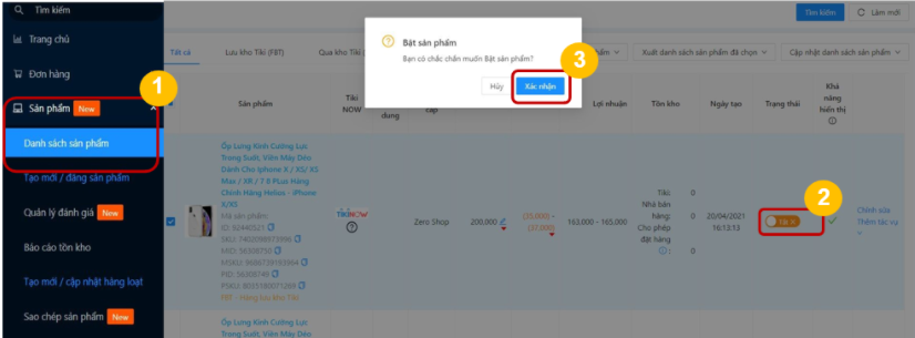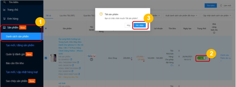 Hướng dẫn thao tác bật - tắt - ẩn từng sản phẩm trên Tiki