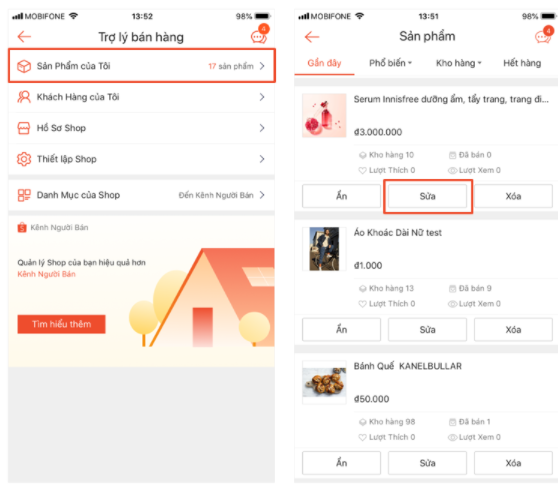 Bước 2: Tiếp theo nhấn vào mục sản phẩm của tôi >> Chọn sản phẩm cần thay đổi >> Sửa.