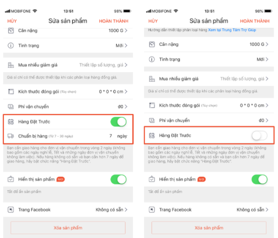 Bước 3: Tại mục sửa sản phẩm, bạn sẽ thấy mục hàng đặt trước ở bên dưới, bạn có thể tắt hoặc bật chế độ chuẩn bị hàng đặt trước.