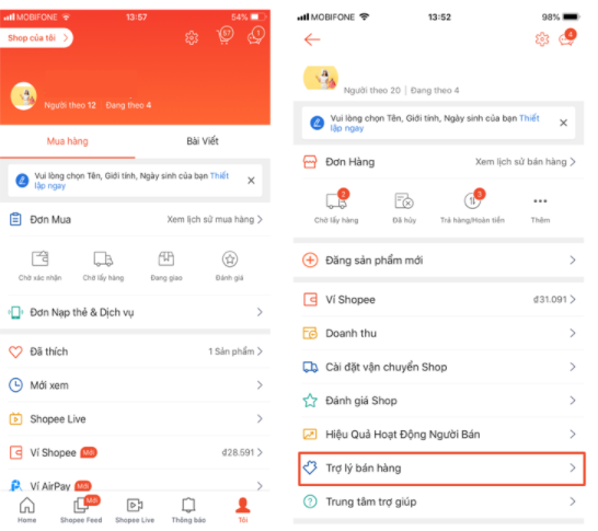Bước 1: Đầu tiên vào Tôi trên ứng dụng shopee >> Shop của tôi > Trợ lý bán hàng.