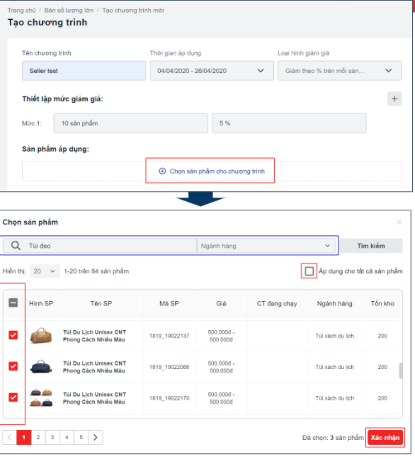 Bước 3: Thêm trang tạo chương trình và bấm chọn sản phẩm cho chương trình.