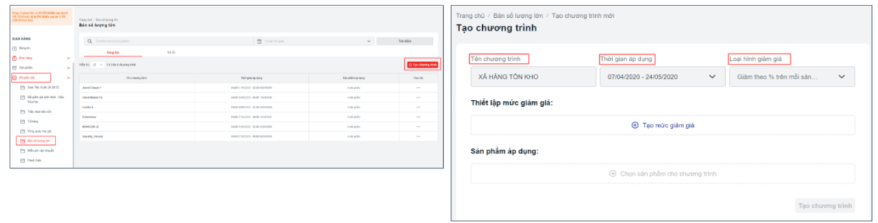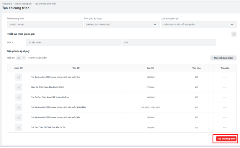 Sau khi thêm sản phẩm vào chương trình, Shop có thể xem lại các thông tin mình đã tạo, sau đó bấm nút “Tạo chương trình” nằm ở cuối trang để tạo chương trình Bán số lượng lớn đó.