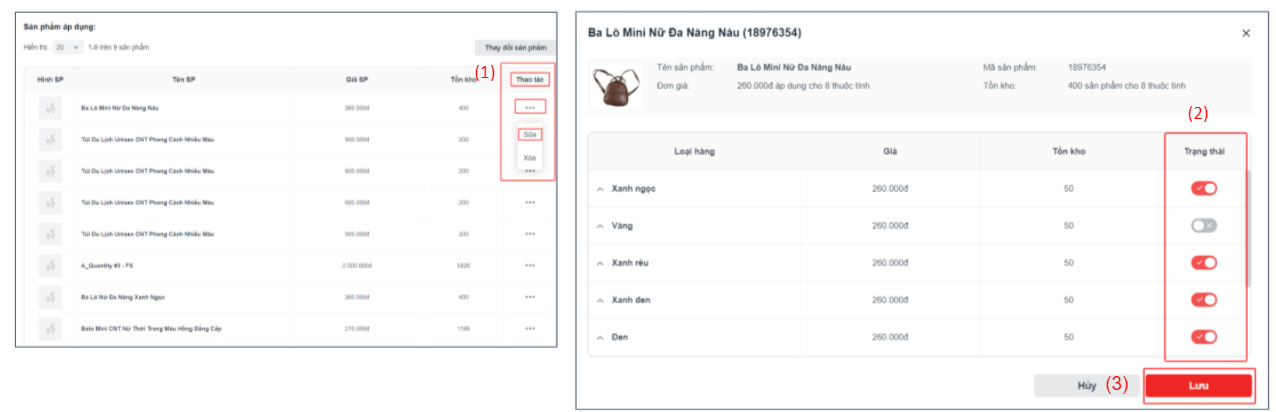 + Có thể chọn Áp dụng tất cả hoặc Chọn từng sản phẩm (Bằng cách bấm vào ô tương ứng ở danh sách sản phẩm bên dưới.)