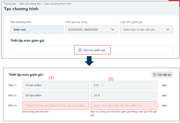 + Chương trình cho phép cài đặt tối đa ba mức giá, mức sau phải có số sản phẩm và mức giảm giá lớn hơn mức trước. (Mức 3 > Mức 2 > Mức 1).