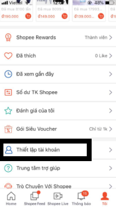Bước 1: Đầu tiên truy cập vào ứng dụng Shopee trên điện thoại, Vào mục Tôi chọn biểu tượng Thiết lập tài khoản.