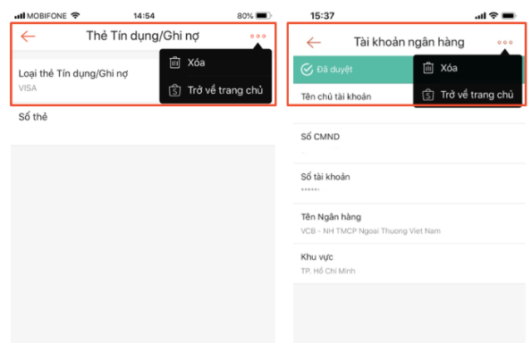 Bước 3: Chọn tài khoản ngân hàng / thẻ tín dụng / ghi nợ cần xóa