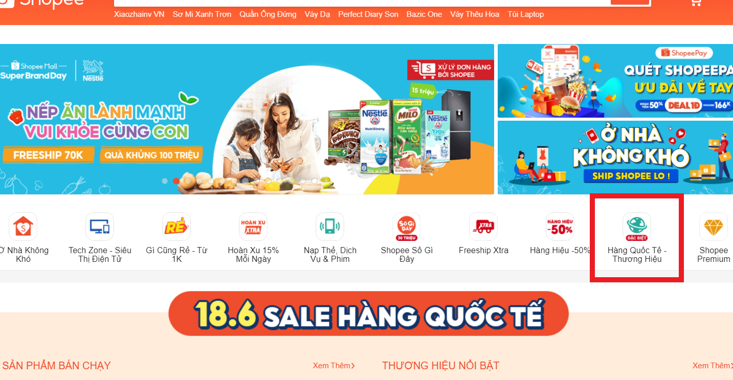 Bước 1: Bạn vào mục “Hàng quốc tế - Thương hiệu” để tìm và lựa chọn sản phẩm mình cần mua.
