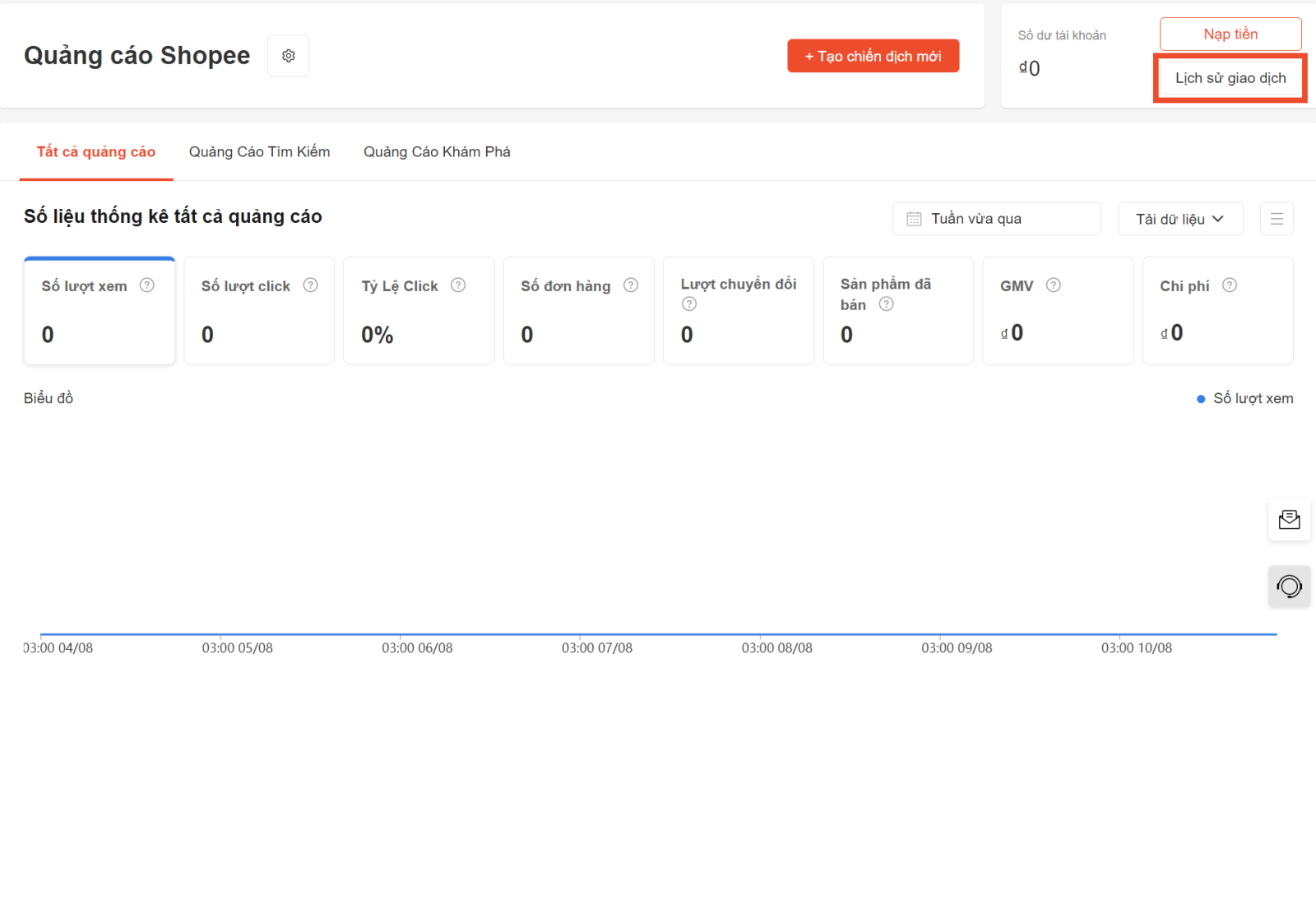 Quảng cáo Shopee hoạt động dựa trên chi phí trả trước. Hãy nạp tiền trước khi bạn bắt đầu quảng cáo. Xem hướng dẫn nạp tiền tại đây. Quảng cáo của bạn sẽ không được hiển thị nếu Tài khoản Quảng cáo cạn kiệt. Bạn có thể xem Lịch sử giao dịch trong Tài khoản Quảng cáo tại mục "Lịch sử giao dịch" trên Trang chủ Quảng cáo (trong Kênh người bán)