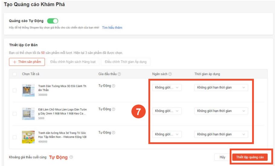 Giá thầu là mức giá tối đa mà bạn sẵn sàng trả cho mỗi lượt click vào quảng cáo. Quảng cáo khám phá trên Shopee sẽ được mặc định ở chế độ “Không giới hạn ngân sách” và “Không giới hạn thời gian”. Bạn vẫn có thể chọn “Thiết lập ngân sách hàng ngày” và “Thiết lập ngày Bắt đầu/Kết thúc” cho mỗi quảng cáo tùy theo nhu cầu của mình.
