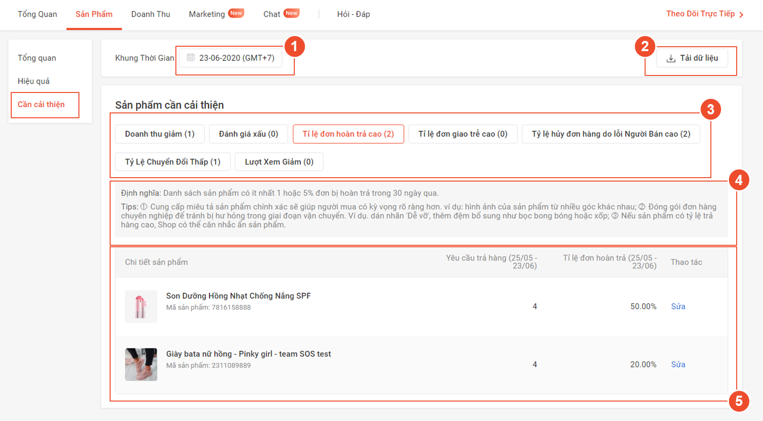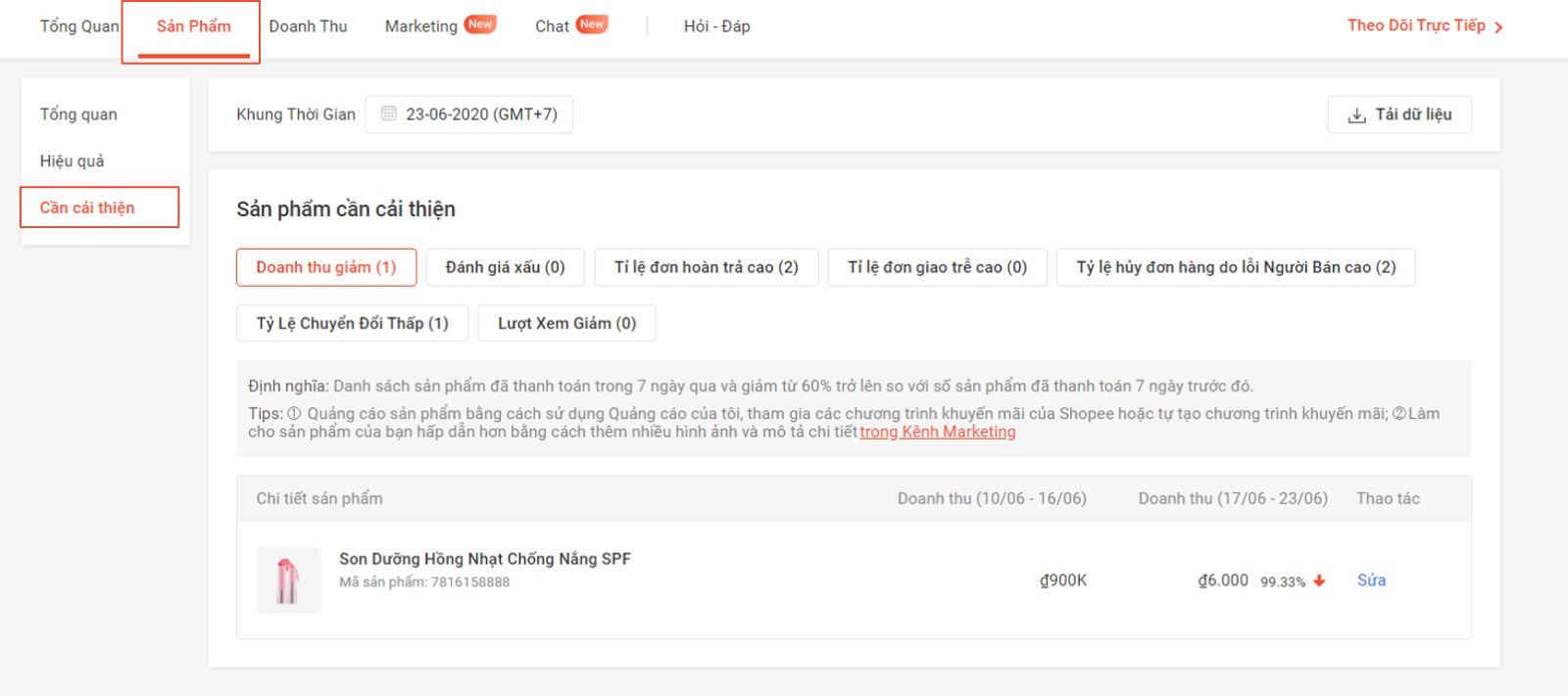 | Doanh thu của sản phẩm giảm mạnh | Lượng đơn hàng và sức bán giảm mạnh | Cải thiện độ hấp dẫn của sản phẩm hoặc sử dụng các công cụ trong Kênh Người bán như các công cụ Marketing, tính năng doanh thu. |