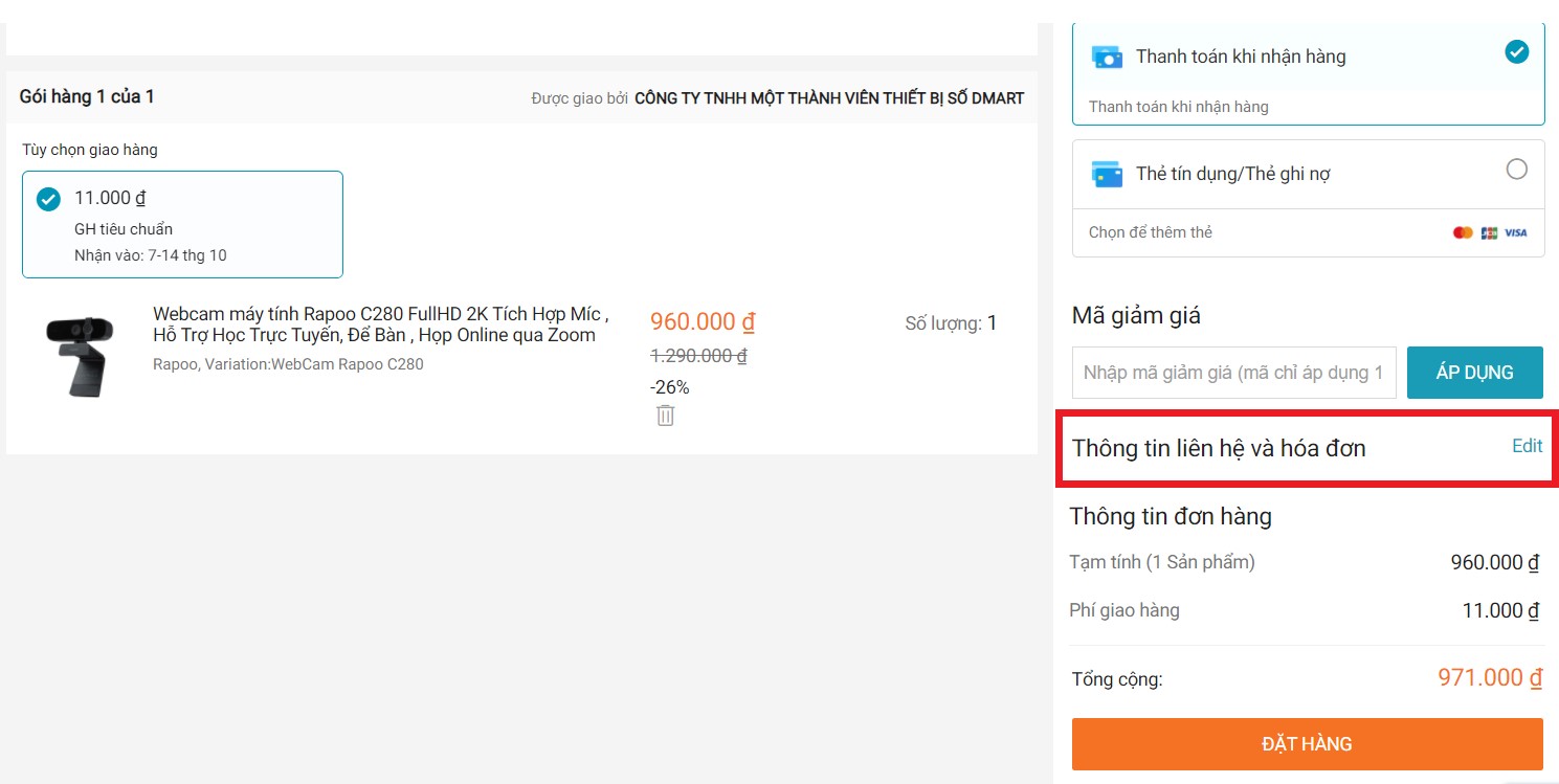 Bước 1: Khi đến giao diện thanh toán, bạn sẽ thấy mục thông tin liên hệ và hóa đơn như hình dưới.
