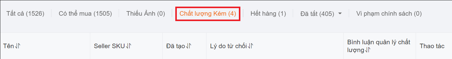 Bước 1: Chọn “Chất lượng kém” để kiểm tra danh sách sản phẩm bị từ chối