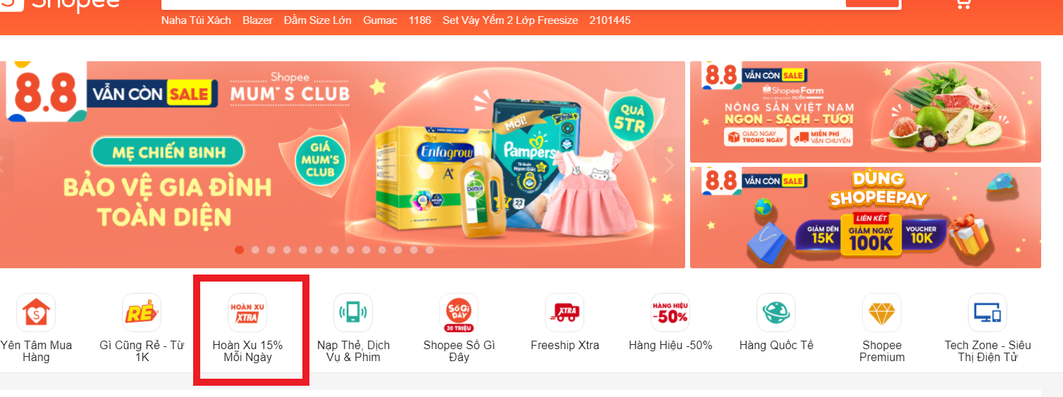 Cách này rất đơn giản, bạn chỉ cần đăng nhập tài khoản Shopee muốn mua hàng. Sau đó vào trang chủ là kéo qua các mục rồi chọn mục “Hoàn xu 15% mỗi ngày” để lấy mã. Trong mục này có đầy đủ mã hoàn xu hiện có trên Shopee nhé. Bạn cứ kéo xuống và tìm mã bạn cần.
