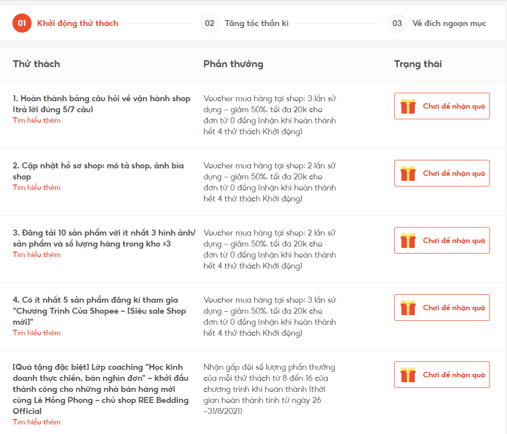 Sau khi đăng ký tham gia thành công, người bán sẽ lần lượt hoàn thành các thử thách theo cấp độ tăng dần, gồm phần khởi động, tăng tốc và về đích. Khi hoàn thành xong thử thách ở cấp độ khởi động, người bán sẽ mở được các nội dung thử thách ở phần cấp độ tiếp theo.