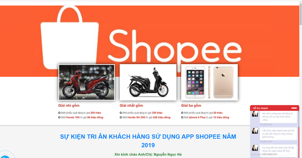Lợi dụng uy tín thương hiệu của sàn thương mại điện tử Shopee, Một số kẻ lừa đảo đã sử dụng hình thức thông báo trúng thưởng một số phần quà có giá trị như túi xách, nước hoa, điện thoại… với danh nghĩa Shopee thường yêu cầu khách hàng trả phí vận chuyển qua tài khoản hoặc qua cú pháp mới có thể nhận được phần thưởng. Đây là hành vi lừa đảo nhằm rút tiền và lấy thông tin cá nhân của khách hàng.