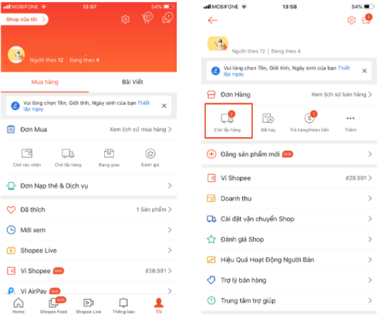 Bước 1: Đầu tiên truy cập tài khoản người bán Shopee, vào mục Tôi >> Shop của Tôi >> Chờ lấy hàng.