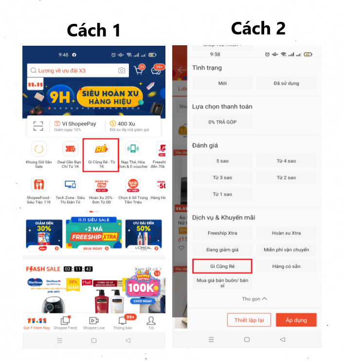 - Thứ hai bạn hãy tìm kiếm sản phẩm qua search tìm kiếm trên Shopee như cách thông thường vẫn làm. Sau đó bạn sẽ nhìn thấy biểu tượng “Lọc” tại góc màn hình bên phải. Nhấn vào đó và tìm đến mục Dịch vụ và khuyến mãi. Cuối cùng bạn click chọn chương trình “Gì Cũng Rẻ” để lọc những sản phẩm đang tham gia.