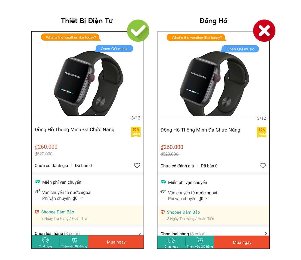 VD: Shop có sản phẩm là đồng hồ thông minh nhưng lại được đăng trên hai danh mục ngành hàng khác nhau là Thiết bị điện tử và Đồng hồ. Trong trường hợp này shop đã vi phạm vào chính sách đăng bán sản phẩm trùng lặp trên Shopee, hơn nữa còn chọn sai ngành hàng vì sản phẩm đồng hồ thông minh nên được đăng thuộc ngành hàng Điện tử thay vì Đồng hồ.