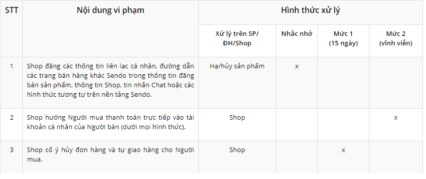 Ngoài ra nếu shop không được sử dụng thông tin người mua để tiến hành các giao dịch ngoài nền tảng Sendo. vi phạm sẽ bị xử lý chế tài cụ thể như sau:
