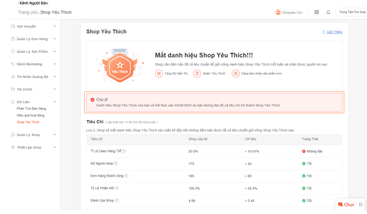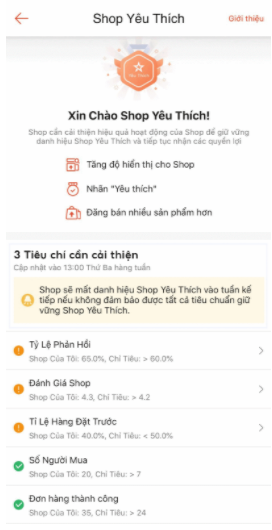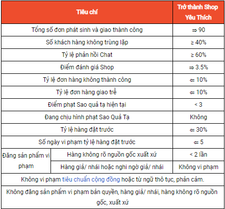 Lưu ý: nếu không đảm bảo được bất kỳ 1 trong các điều kiện duy trì Shop Yêu Thích được nêu ở trên Shop sẽ mất danh hiệu Shop Yêu Thích vào thứ Hai tuần kế tiếp.