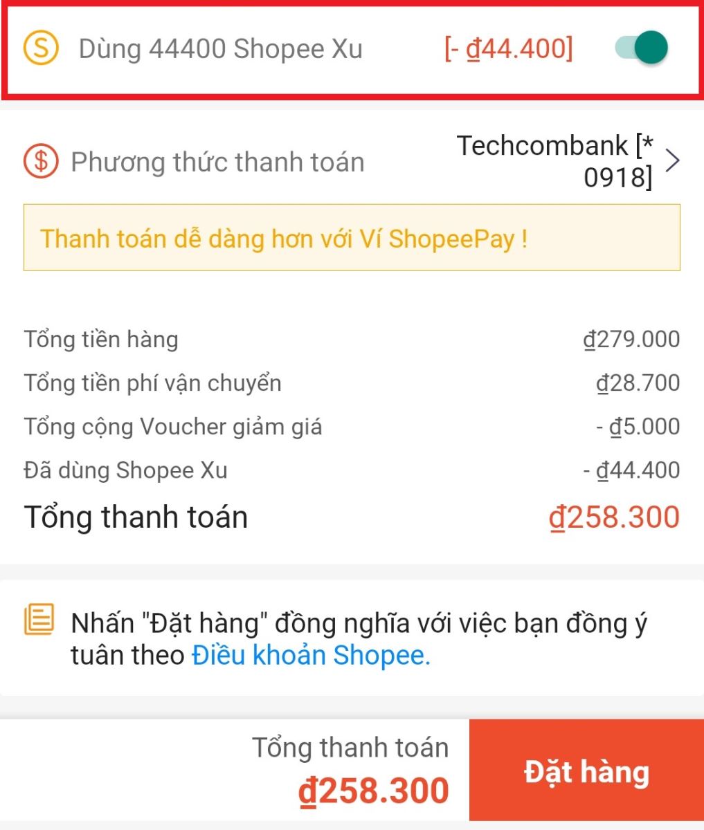 Thao tác rất đơn giản, trong bước thanh toán cuối cùng của đơn hàng, bạn sẽ nhìn thấy một mục là “Dùng….shopee xu” lúc này bạn chỉ cần gạt nút sang xanh là đã có thể khấu trừ cho đơn hàng của mình một số tiền.