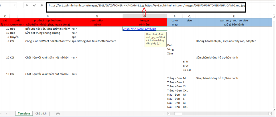 Bước 8: Đã có link hình của sản phẩm, copy paste link hình này vào template, cột “images (Hình ảnh)” Dán nhiều link nếu sản phẩm có nhiều hình, các link cách nhau bởi dấu phẩy và một khoảng trắng.