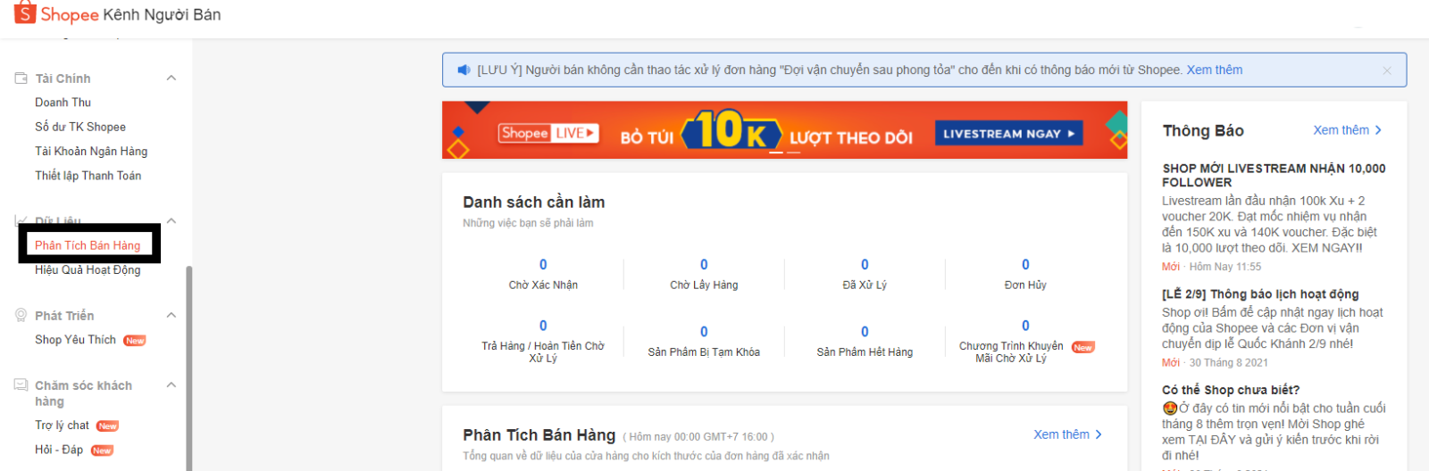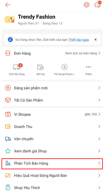 Cách truy cập phân tích bán hàng trên shopee