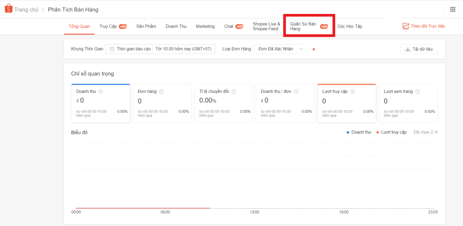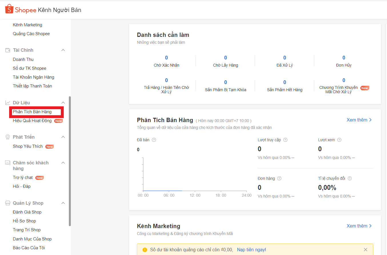 Bước 1: Truy cập vào Kênh người bán => chọn Phân tích bán hàng trong phần Dữ liệu
