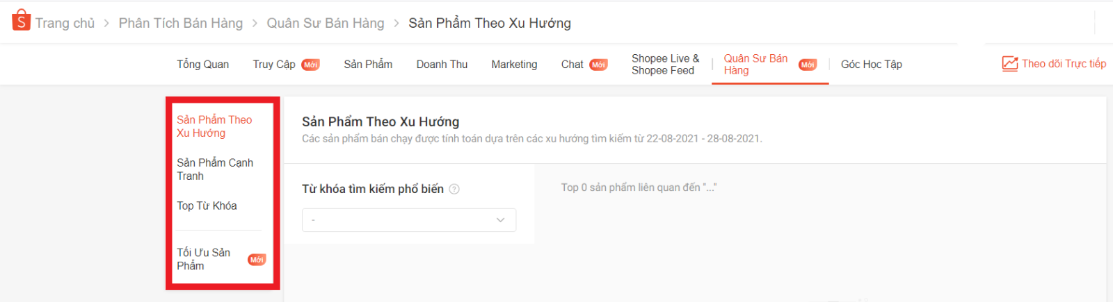 Bước 3: Tại đây sẽ có các tính năng của Quân sư bán hàng gồm Sản phẩm theo xu hướng, Sản phẩm cạnh tranh, Top từ khóa và Tối ưu sản phẩm.