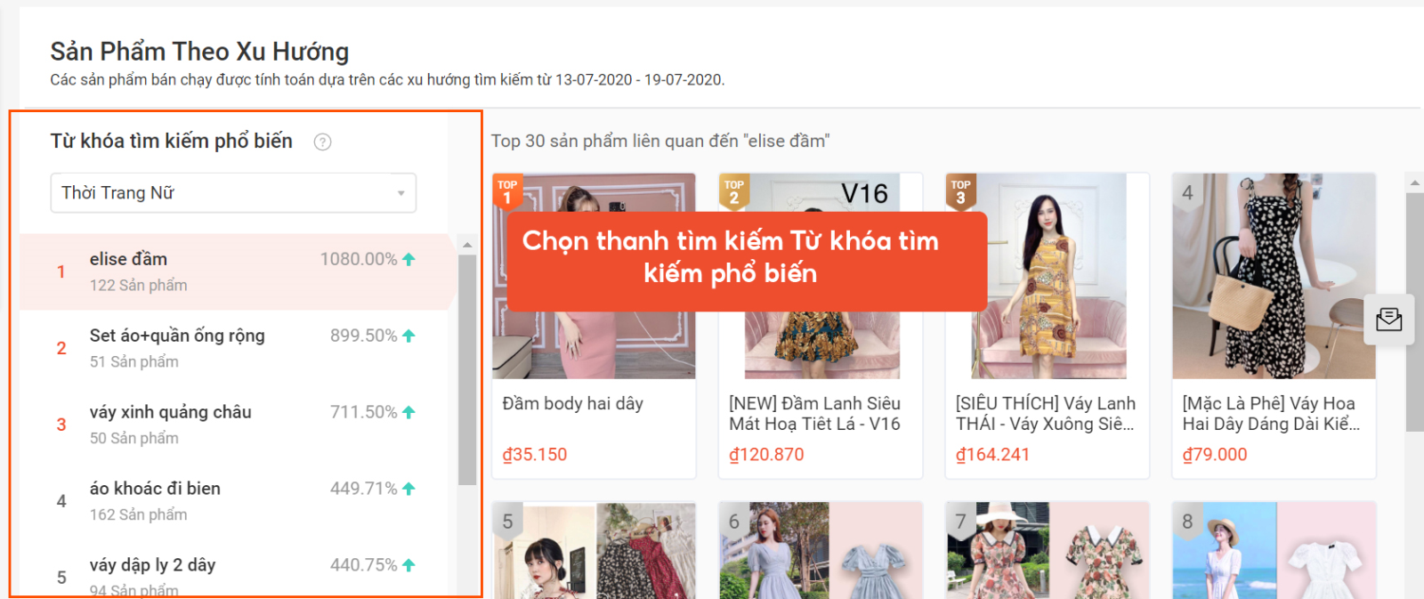 Sản phẩm theo xu hướng hiển thị danh sách các từ khóa thuộc ngành hàng mà Shop đang kinh doanh và có xu hướng đứng đầu lượt tìm kiếm trong vòng 7 ngày gần nhất.