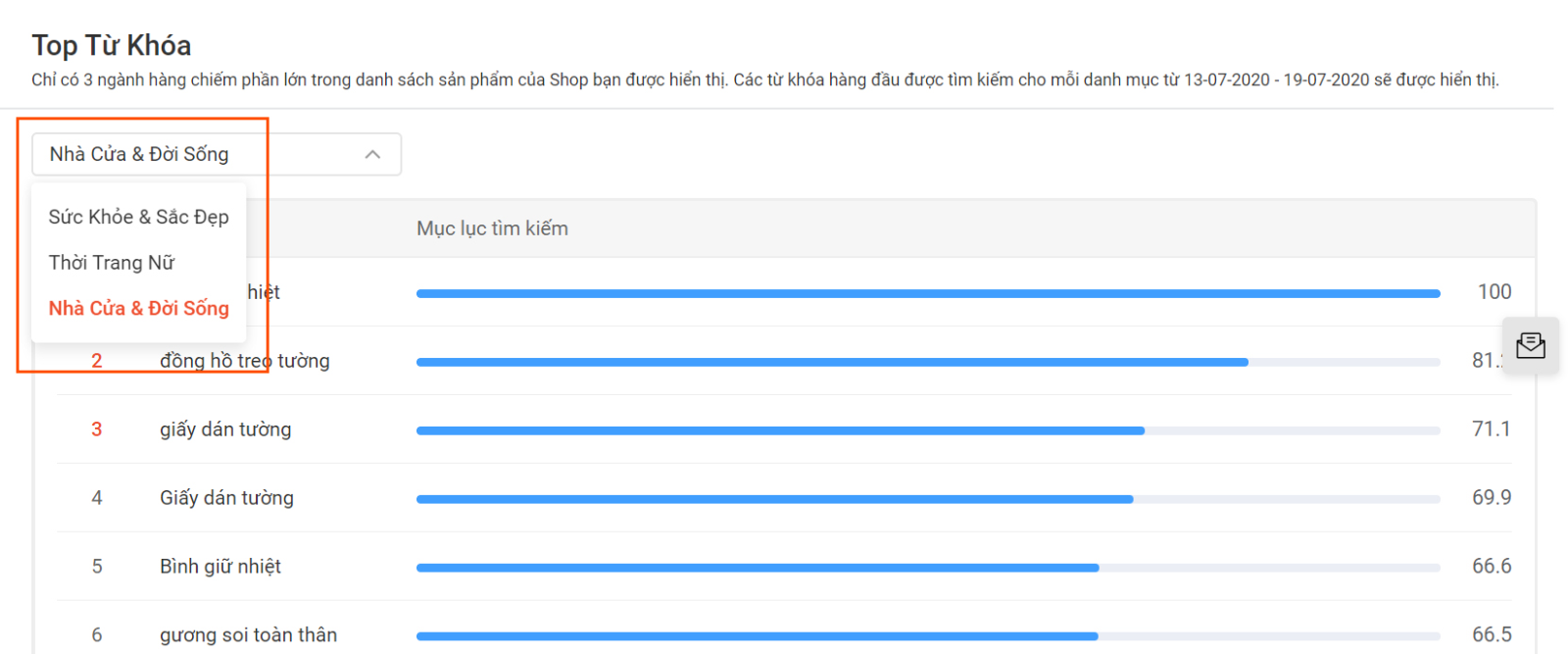 Top từ khóa hiển thị danh sách các từ khóa thuộc ngành hàng mà người bán đang kinh doanh và đứng đầu xu hướng tìm kiếm trong vòng 7 ngày gần nhất. Sử dụng Top Từ Khóa có thể cho người bán thêm các gợi ý sản phẩm mới để gia tăng doanh số cho Shop của mình và dễ dàng lập kế hoạch đầu tư quảng cáo trên Shopee (Đầu thầu từ khóa, Quảng cáo liên quan).