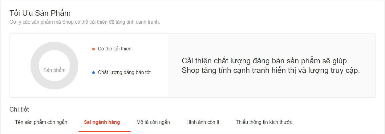 Tính năng này sẽ liệt kê cho shop số lượng các sản phẩm có chất lượng đăng bán tốt và các sản phẩm cần phải cải thiện chất lượng đăng bán để tăng tính cạnh tranh và lượng truy cập cho shop.