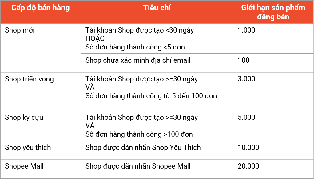 Hàng tuần, Shopee sẽ phân Người bán vào 1 trong 5 quota đăng sản phẩm tùy theo cấp độ bán hàng của Shop. Ở mỗi cấp độ, Shop sẽ có số lượng sản phẩm tối đa được đăng bán khác nhau.
