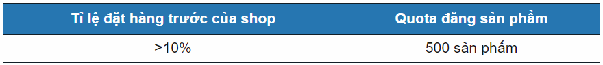 Quota đăng sản phẩm sẽ được tính dựa trên 3 tiêu chí: Cấp độ bán hàng; Hệ thống Sao Quả Tạ; Tỷ lệ Hàng đặt trước