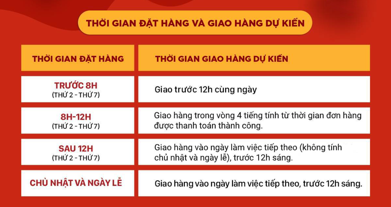 Dịch vụ này không được áp dụng vào ngày chủ nhật. Vào ngày lễ và 1 ngày trước lễ hoặc ngày nghỉ của đơn vị vận chuyển.