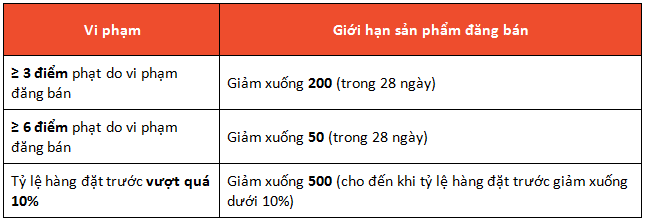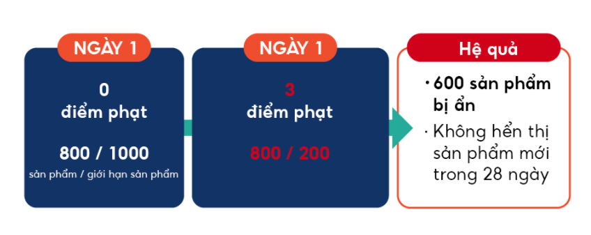 Ví dụ: Nếu người bán vi phạm chính sách đăng bán sản phẩm và shop đã vượt quá Giới hạn đăng bán sản phẩm, sản phẩm mới đăng bán sẽ không thể hiển thị trong 28 ngày và những sản phẩm vượt quá giới hạn sẽ bị ẩn.