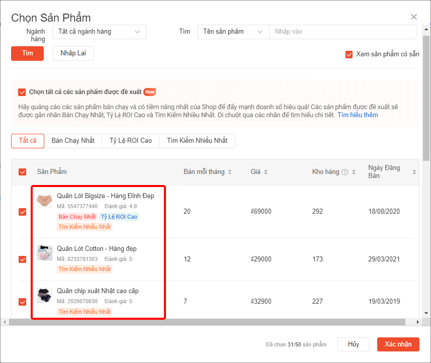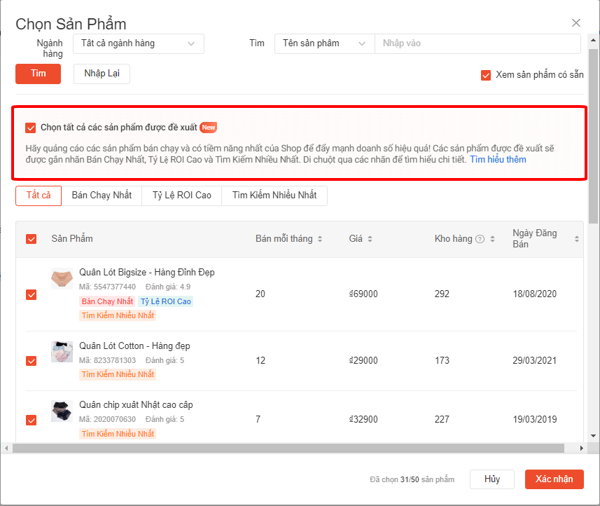 Khi chọn sản phẩm nào để quảng cáo, mục Chọn Sản Phẩm của Quảng cáo Shopee giờ đây sẽ đề xuất ba danh mục sản phẩm tiềm năng cao dựa trên dữ liệu của Shopee: Bán Chạy Nhất, Tỷ Lệ ROI Cao và Tìm Kiếm Nhiều Nhất.