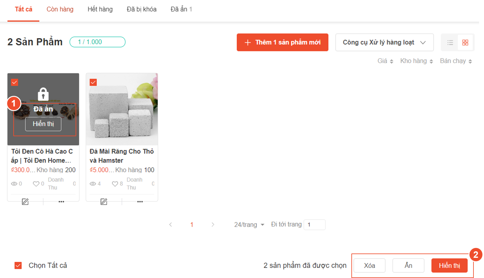 Trong quá trình đăng bán, có thể bạn không để ý khiến sản phẩm của mình bị rơi vào mục “Ẩn” nên đương nhiên là nó sẽ không được tìm thấy trên Shopee. Để khắc phục bạn chỉ cần vào mục Tất cả sản phẩm => nhấn vào sản phẩm bị ẩn => chọn Hiển thị là xong.