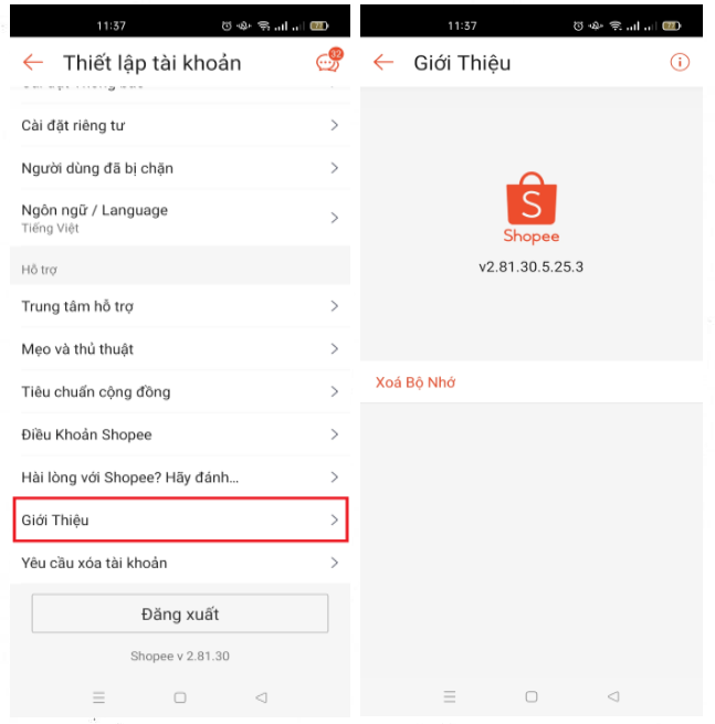 Bạn chọn Thiết lập tài khoản từ mục Tôi trên ứng dụng Shopee => chọn Thiết lập tài khoản => chọn Giới thiệu => Chọn Xóa bộ nhớ.