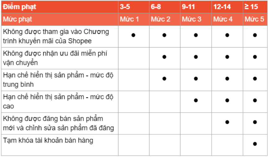 Nếu tài khoản của bạn đang có điểm sao quả tạ vượt mức quy định thì Shop sẽ bị tạm thời hạn chế đặc quyền dành riêng cho người bán. Số điểm phạt càng cao, đặc quyền của bạn càng bị hạn chế trong đó có việc bị hạn chế hiển thị sản phẩm: