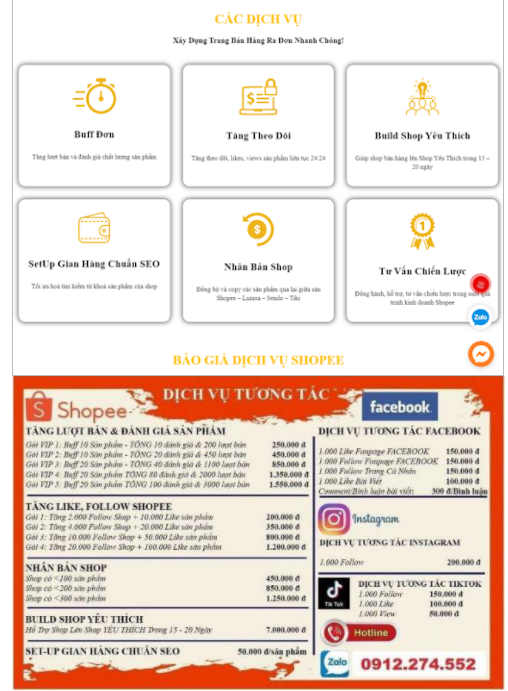 Dịch vụ hỗ trợ buff chỉ số ảo thường sẽ gửi tin nhắn cho Shop để quảng bá về cách tăng đơn hàng với những đánh giá tích cực, lượng người theo dõi và số lượt thích sản phẩm.
