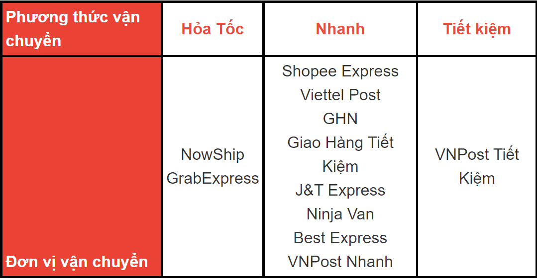 Nếu sản phẩm bạn mua chỉ có các phương thức vận chuyển mới là: Hỏa tốc, Nhanh và Tiết kiệm thì bạn không thể chọn phương thức vận chuyển khác.