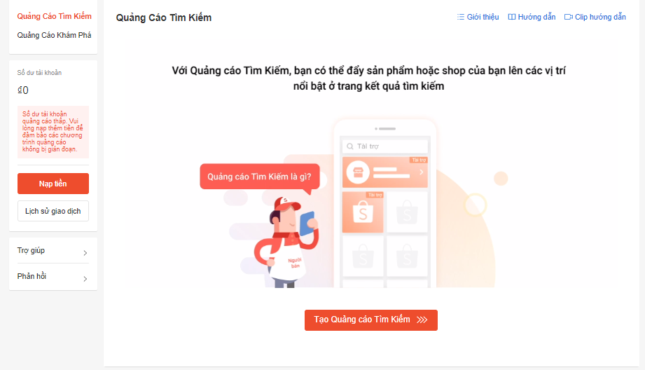 Bước 2: Trước khi chạy quảng cáo, bạn cần kiểm tra số dư trong ví Shopee.