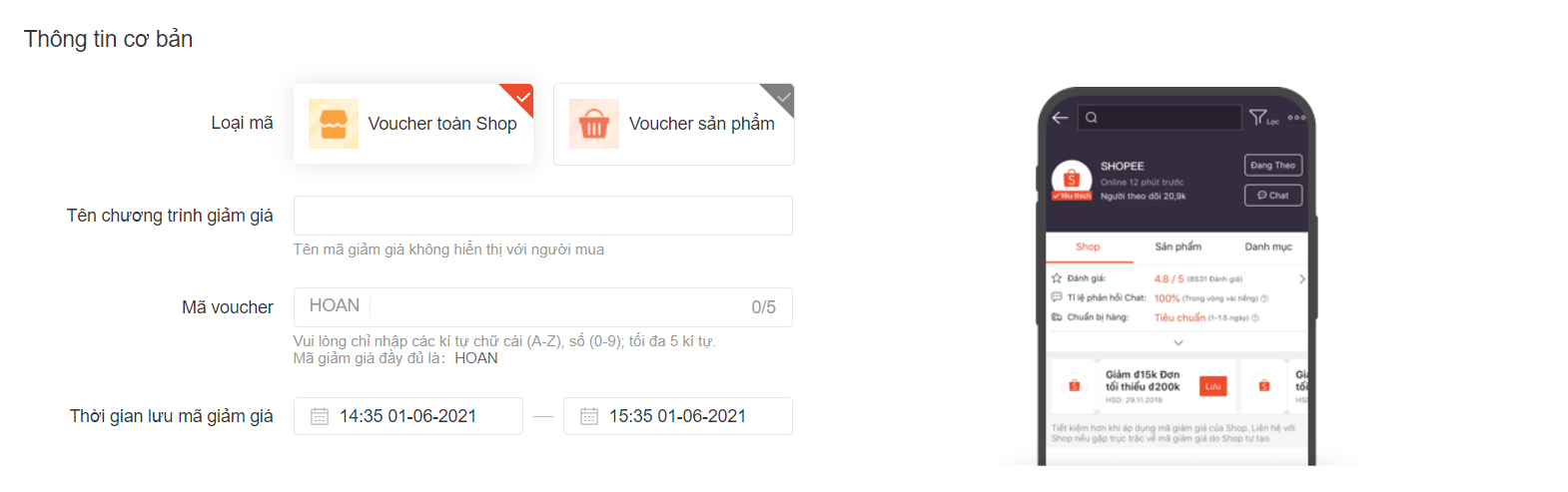 Lưu ý là trước khi đính kèm Mã giảm giá vào bài đăng, người bán cần thiết lập “Voucher toàn Shop” thông qua mục mã giảm giá của tôi tại Kênh Marketing.