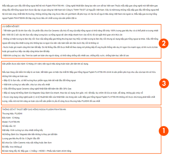 Cung cấp thông tin mô tả sản phẩm chính xác và chi tiết. Cung cấp đầy đủ thông số kỹ thuật sản phẩm, làm nổi bật lợi ích và giá trị mà sản phẩm đem đến cho khách hàng, cam kết chất lượng và bảo hành.