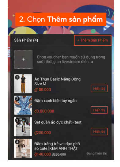 + Tiếp theo click vào mục thêm sản phẩm, bạn nên lựa chọn sản phẩm nổi bật để thu hút sự chú ý từ phía người dùng. Lưu ý bạn không thể thay đổi thứ tự sản phẩm trong lúc livestream bán hàng.
