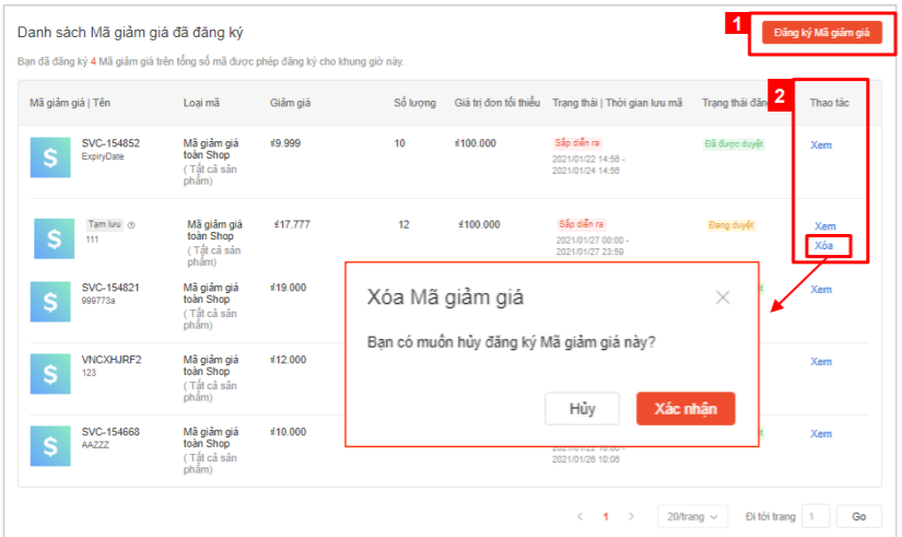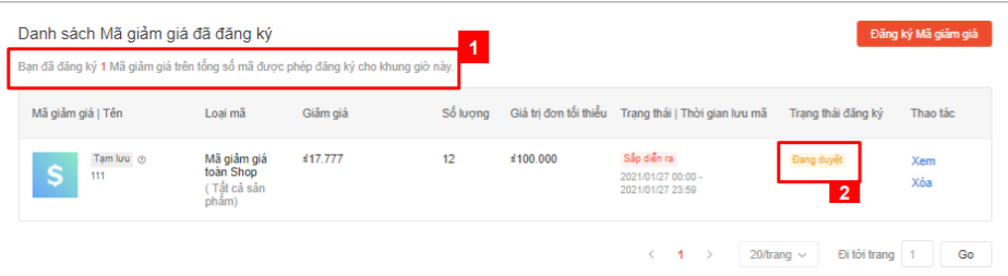 Danh sách mã giảm giá này sẽ hiển thị tất cả các mã mà Shop bạn đã đăng ký (đã được duyệt, đang diễn ra, đã bị từ chối v.v). Qua đó bạn sẽ biết được chương trình nào mình đăng ký thành công.