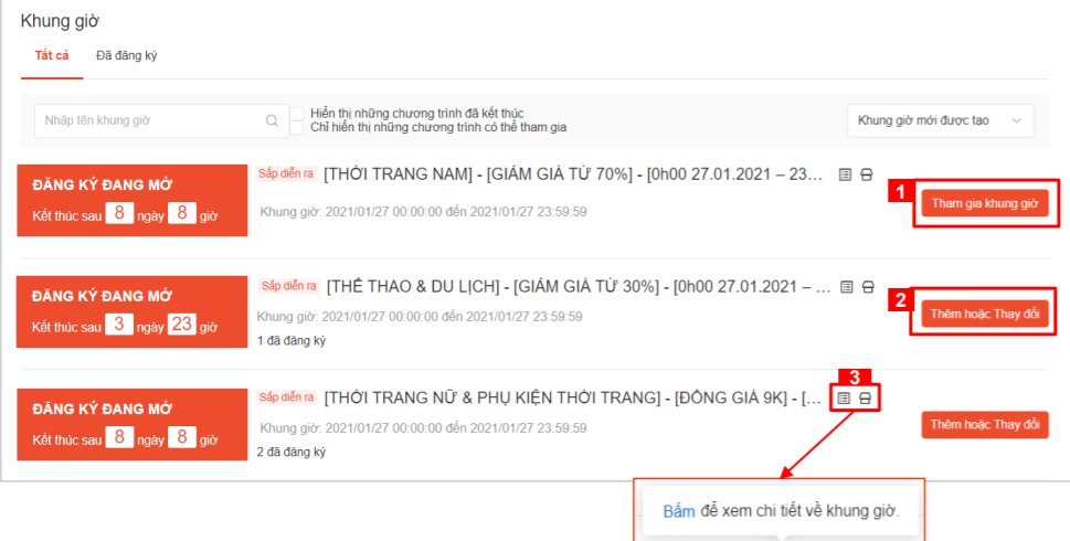 Bước 6: Chọn Đăng ký Mã giảm giá để tham gia vào các khung giờ với mã giảm giá có sẵn hoặc tạo mới để hoàn thành việc đăng ký mã giảm giá.